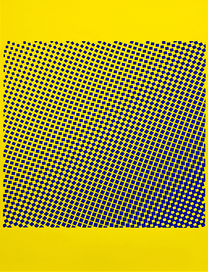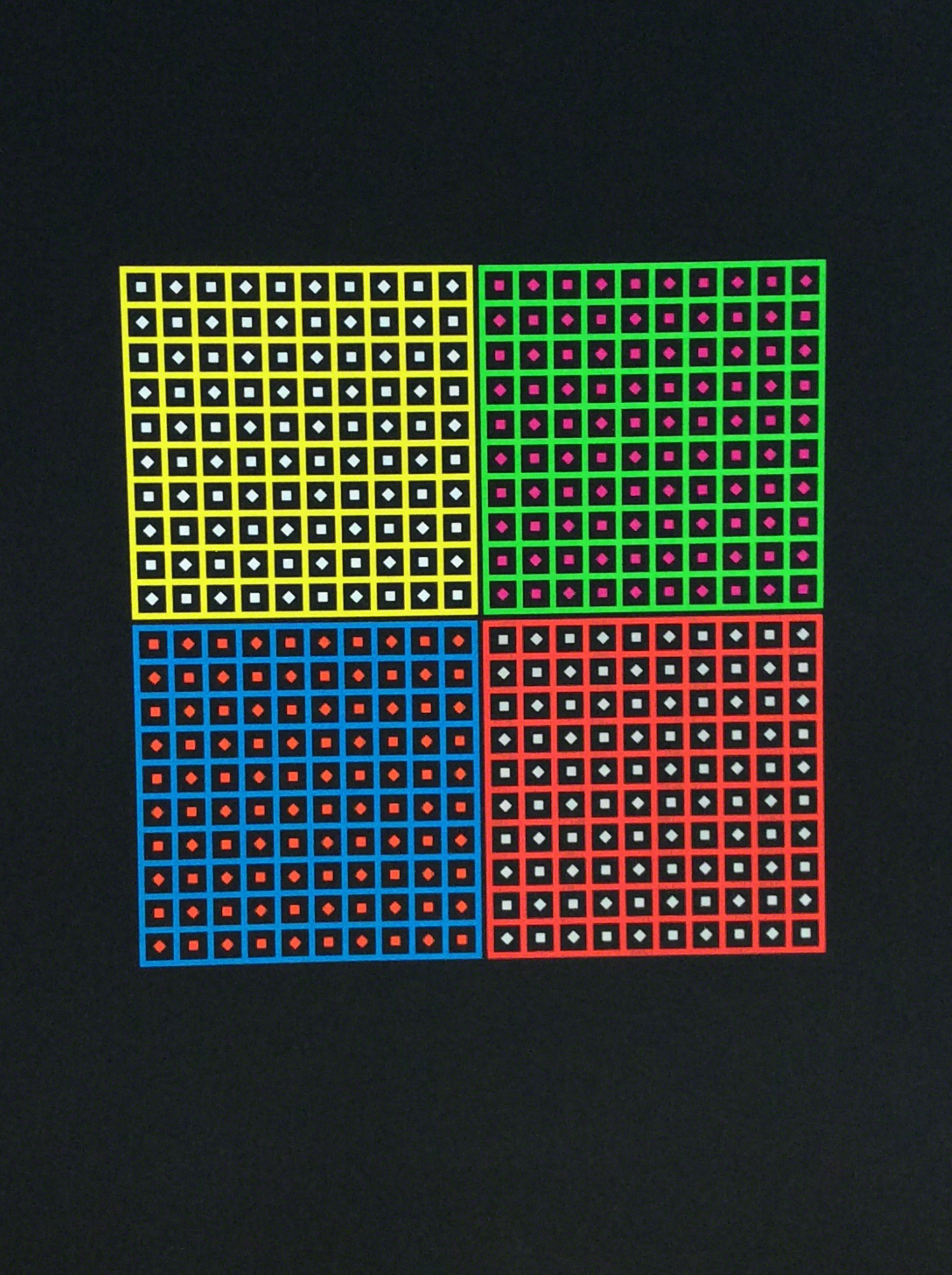 This screenprinting in black and white, when you look, the brain added color: red, mauve, bright yellow, green brilliant. It is the game of the optical illusion and our brain.. You must see the original silkscreen to see these illusions, the internet will not reveal these illusions to you. Digital distorts illusion.