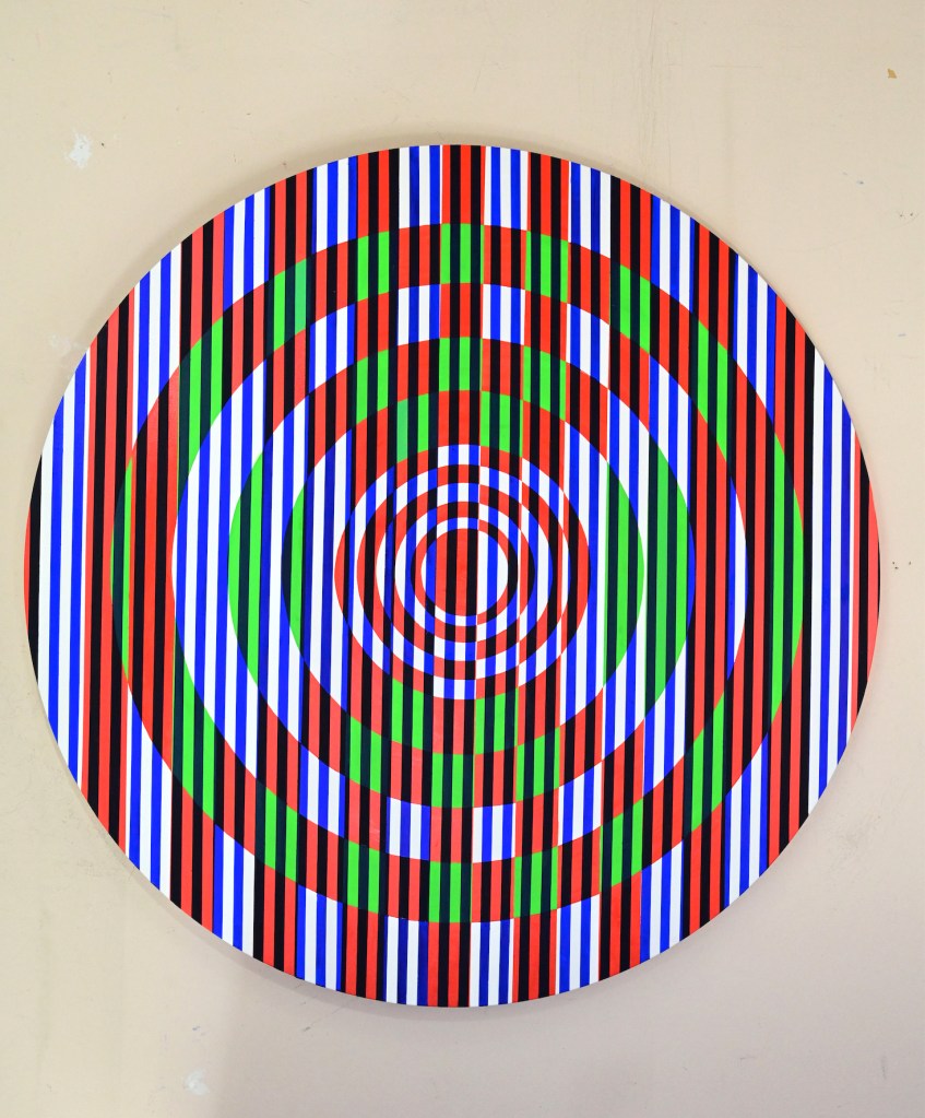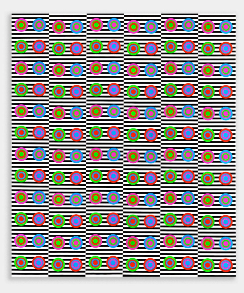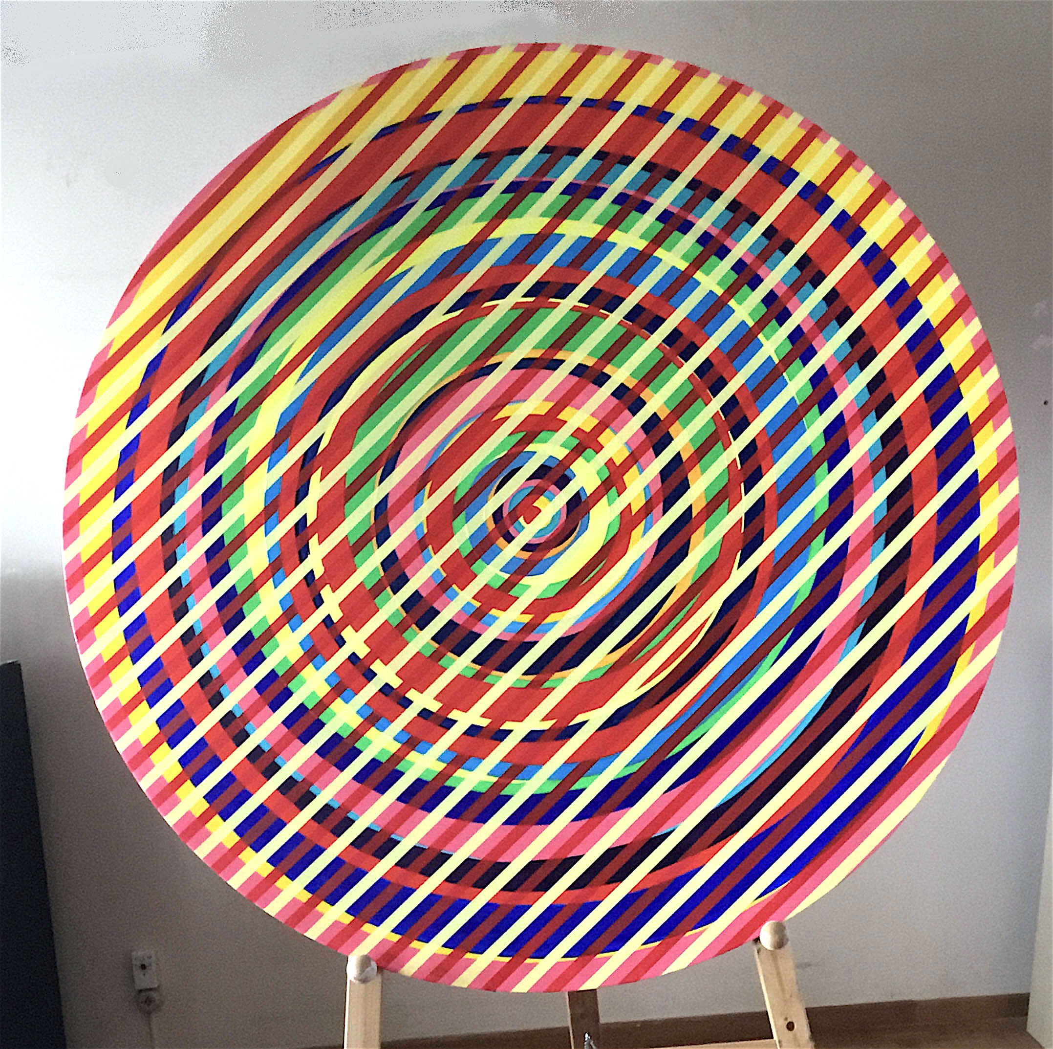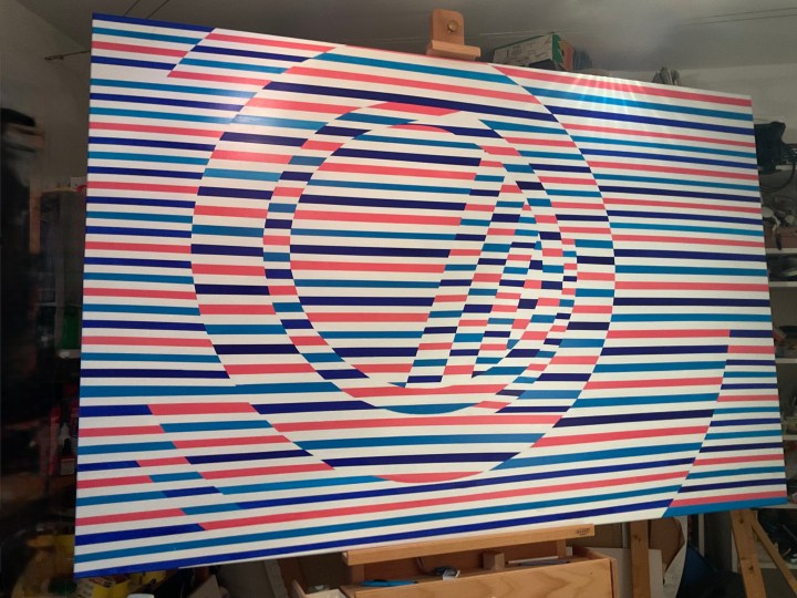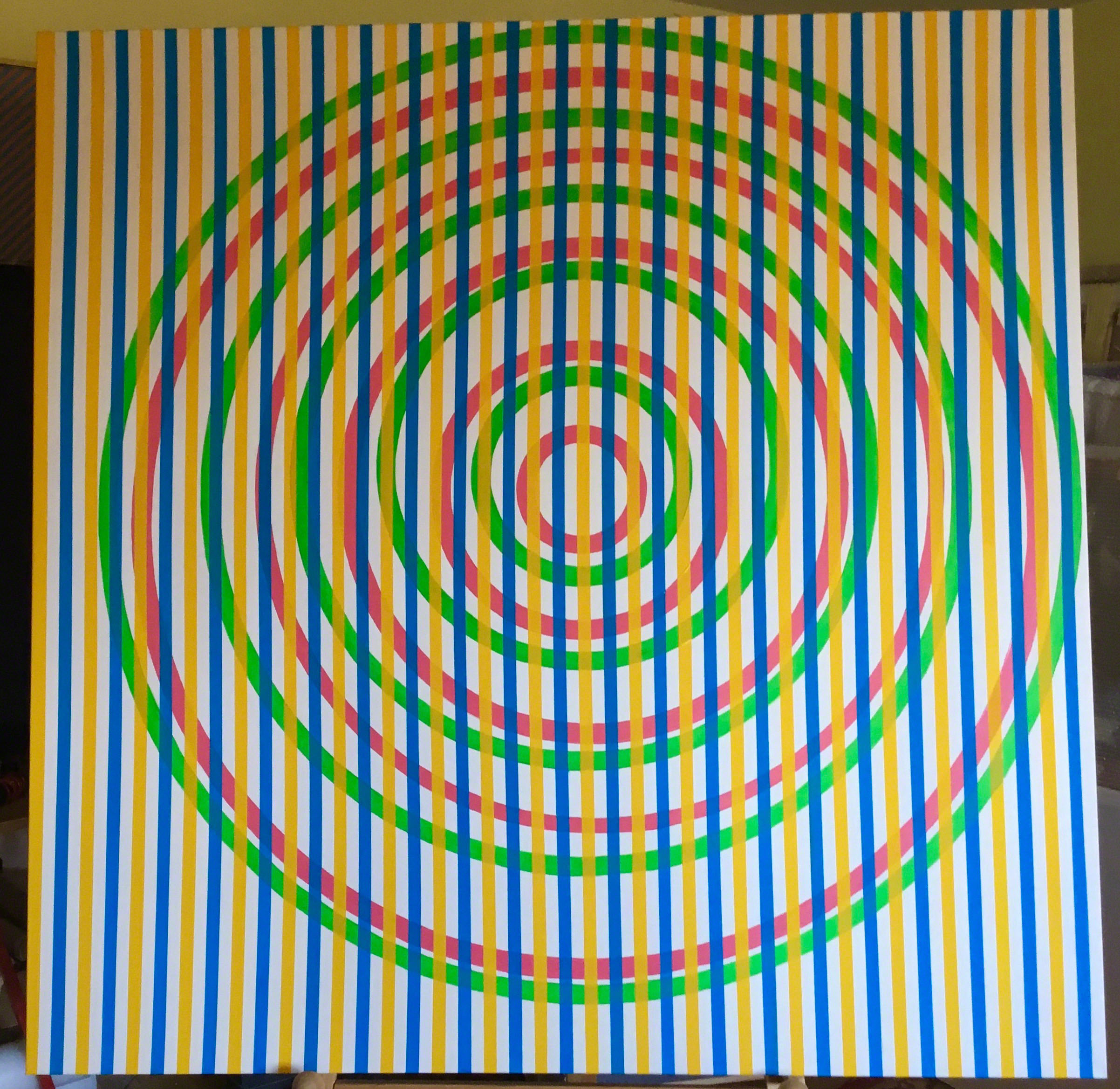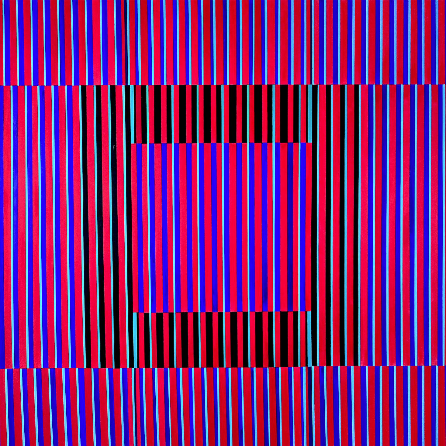 In this Op Art painting (oil on linen canvas), although static, an optical illusion is revealed in a truly unique way. To perceive it, simply photograph the original work with a smartphone or tablet: the illusion will then appear directly on your screen, changing your perception and you will discover the illusion.