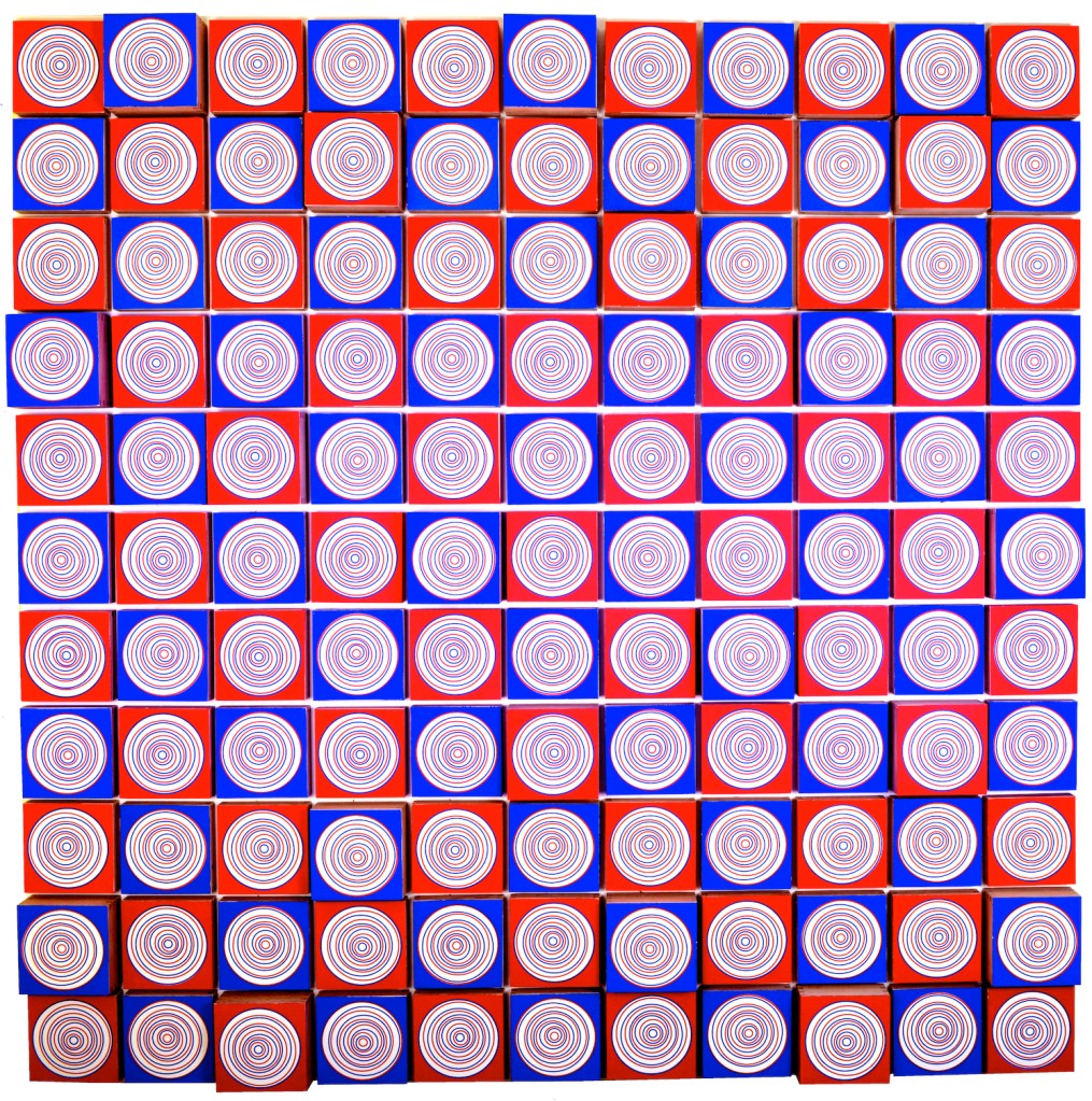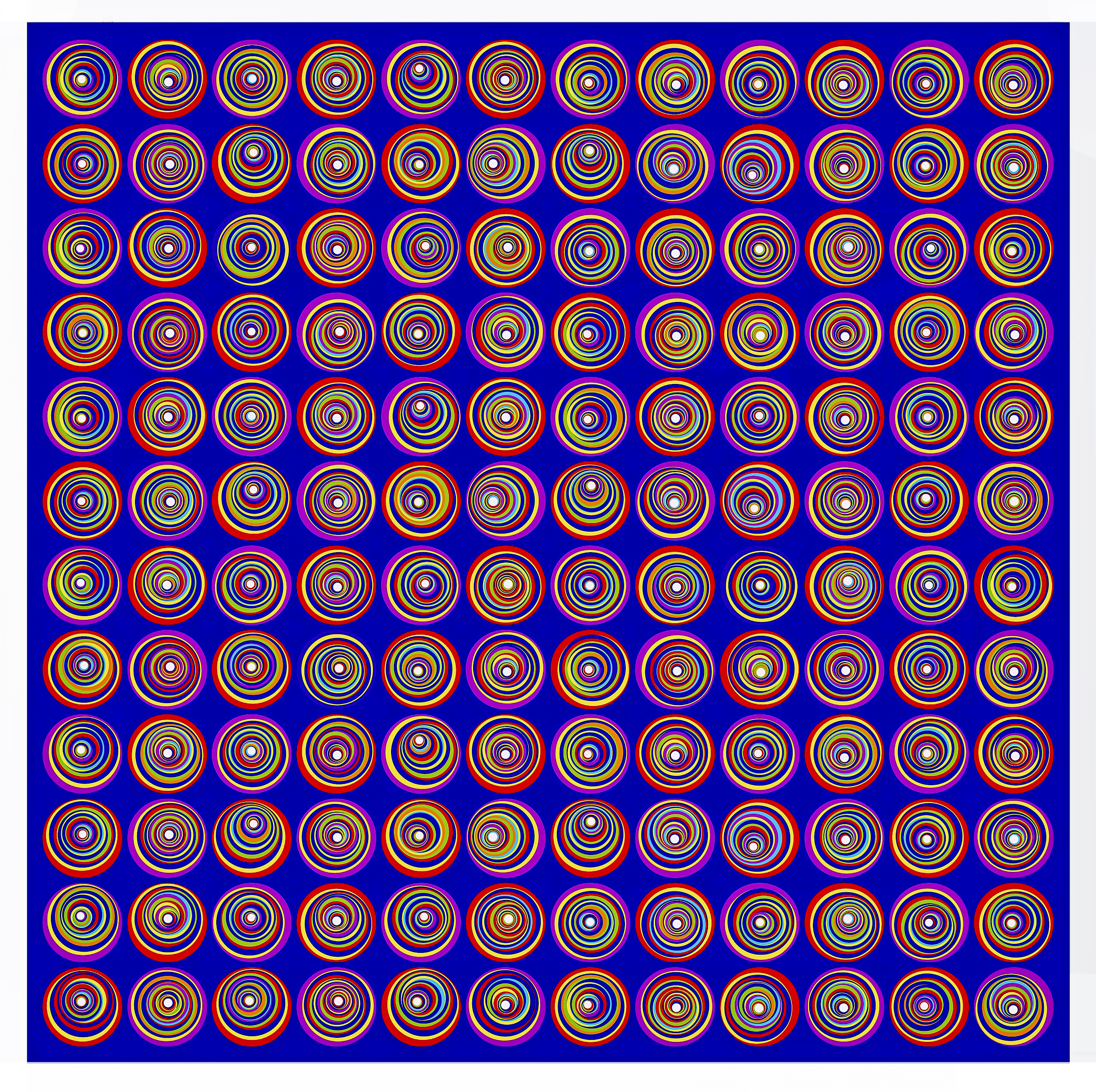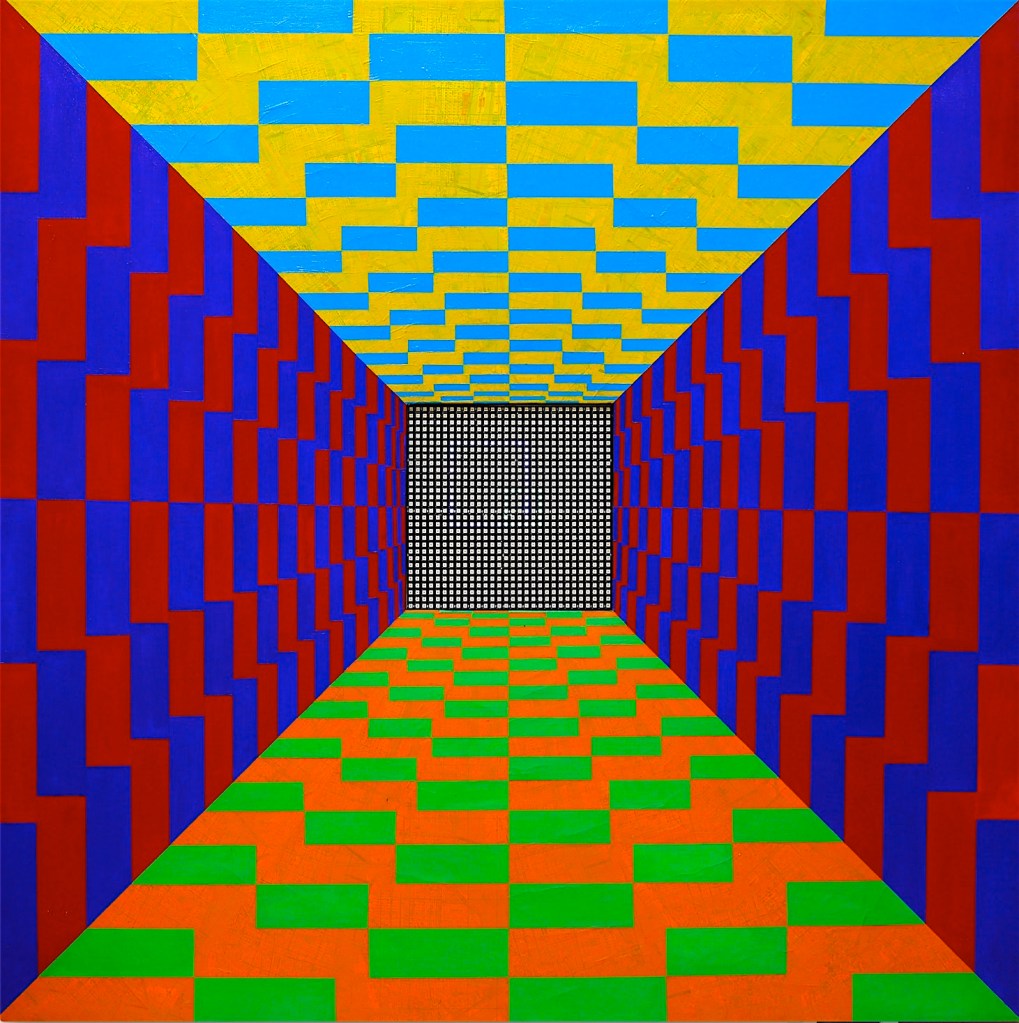 Op Art stimulates neuronal activity: neurons interpret geometric structure, frequency, and vibration. Depending on viewing distance and angle, they mentally reconstruct an illusory three-dimensional depth where geometric forms seem to appear and disappear, while certain colors transform into others. From a flat surface, perception creates visual depth and motion.