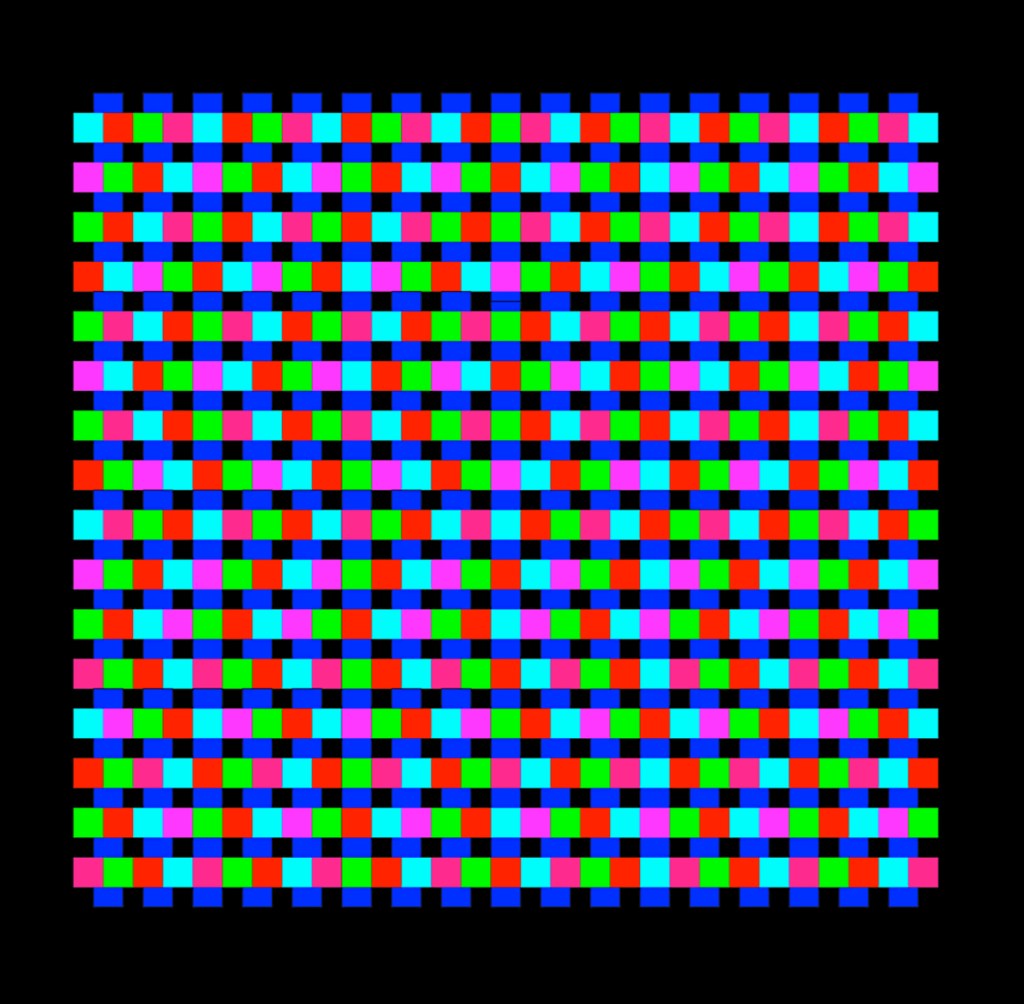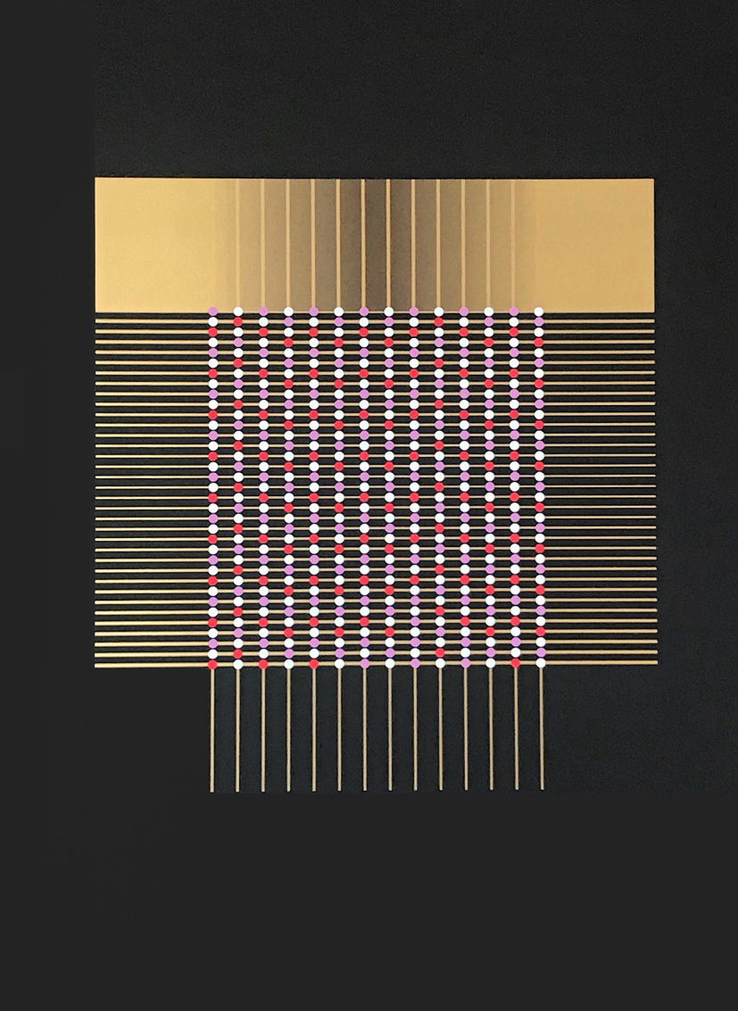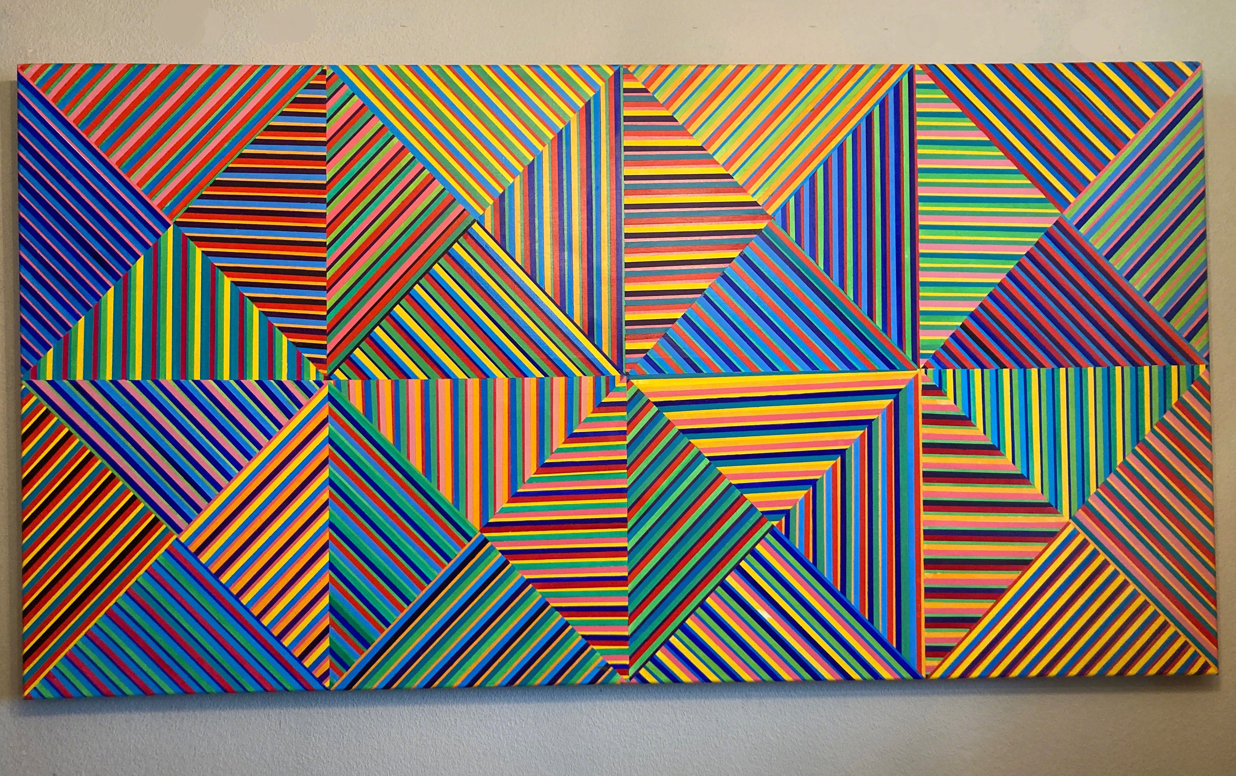 Op Art stimulates neuronal activity: neurons interpret geometric structure, frequency, and vibration. Depending on viewing distance and angle, they mentally reconstruct an illusory three-dimensional depth where geometric forms seem to appear and disappear, while certain colors transform into others. From a flat surface, perception creates visual depth and motion.