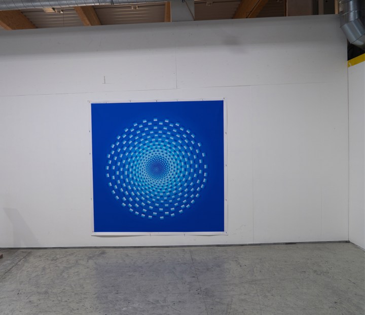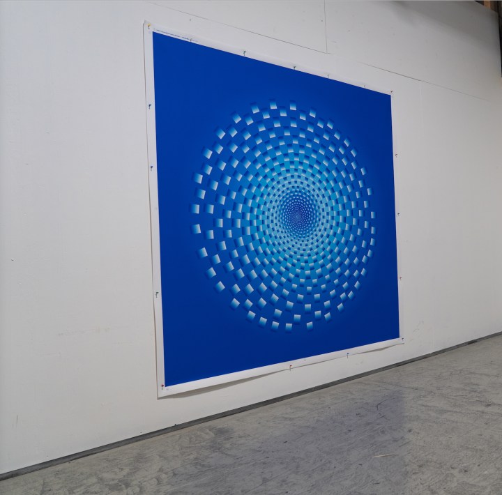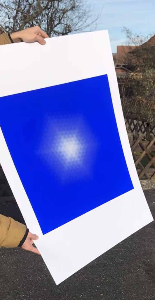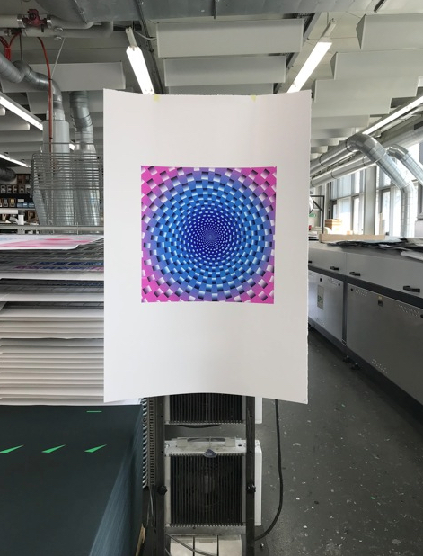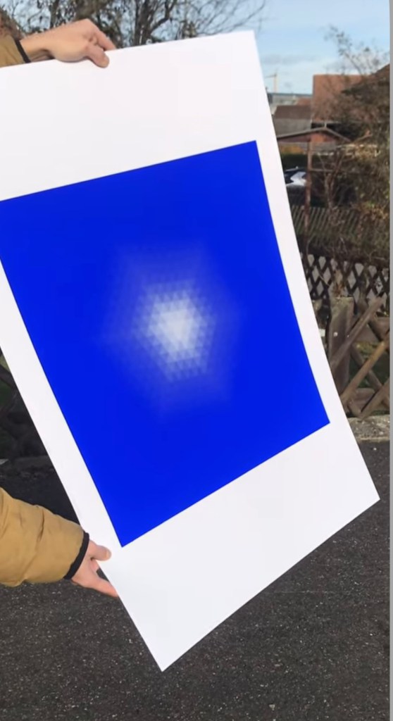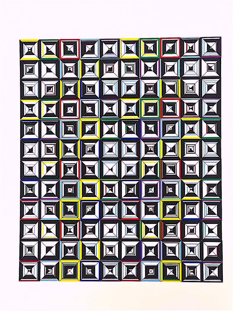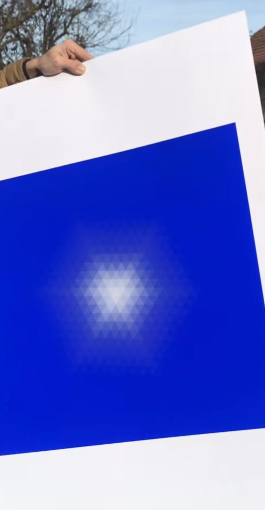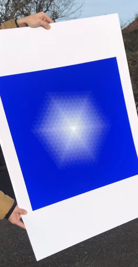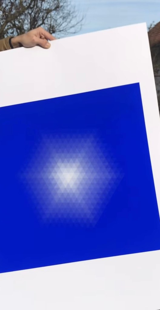 the image changes depending on the angle, the distance..A captivating new artwork: geometric shapes that appear and disappear, transforming into smaller dimensions, accompanied by Youri Messen-Jaschin’s latest screen print on paper. How is it possible for a static shape, printed on a flat surface, to seemingly change dimensions so strikingly before the viewer’s eyes?