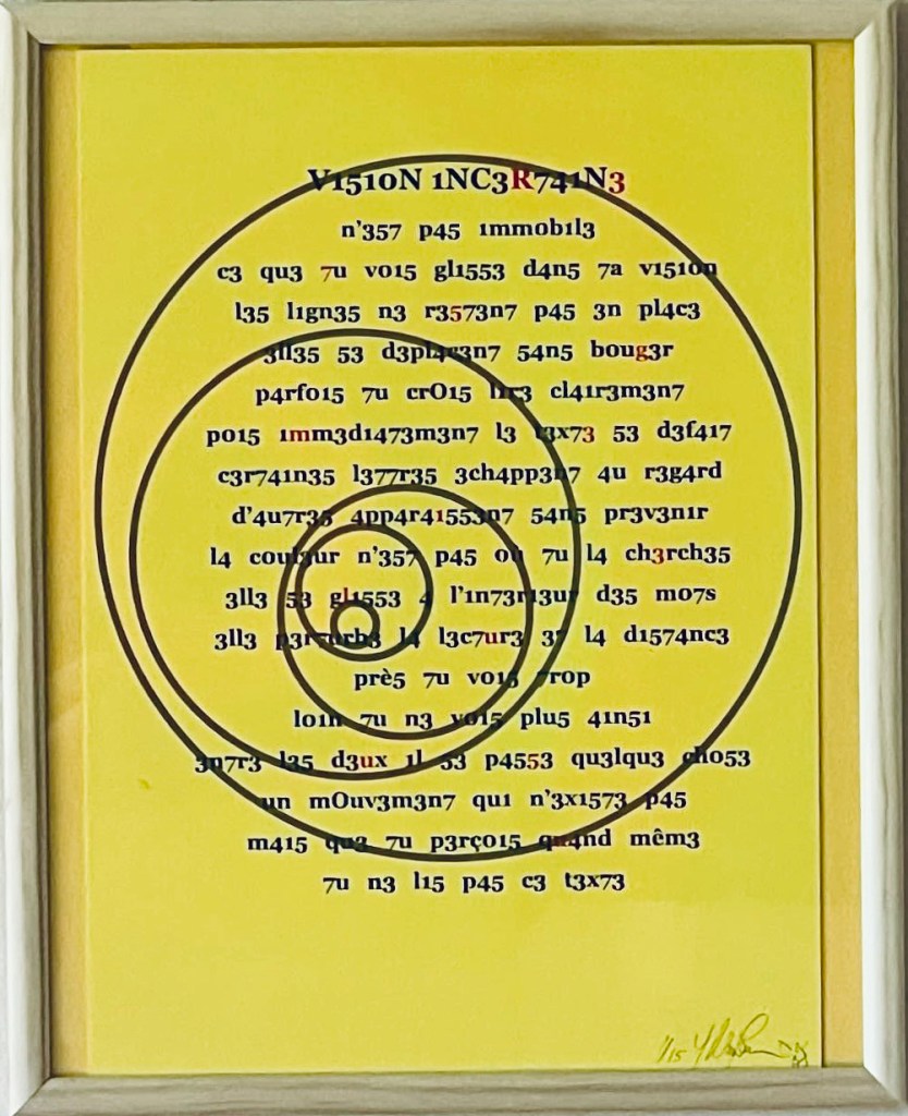 these works explore the frontier between reading and perception, language becomes an optical art event…